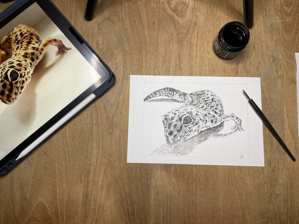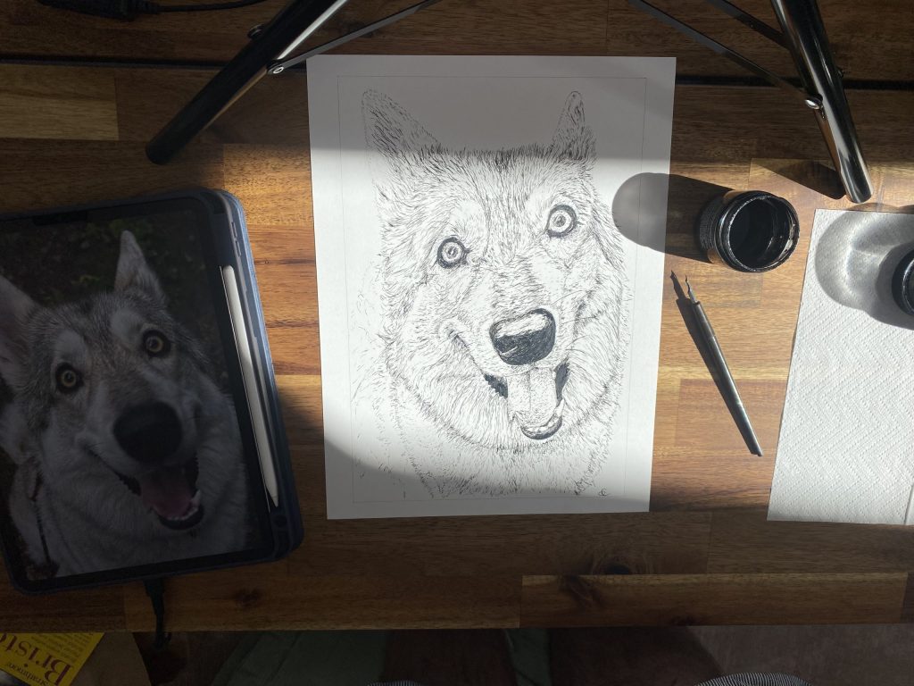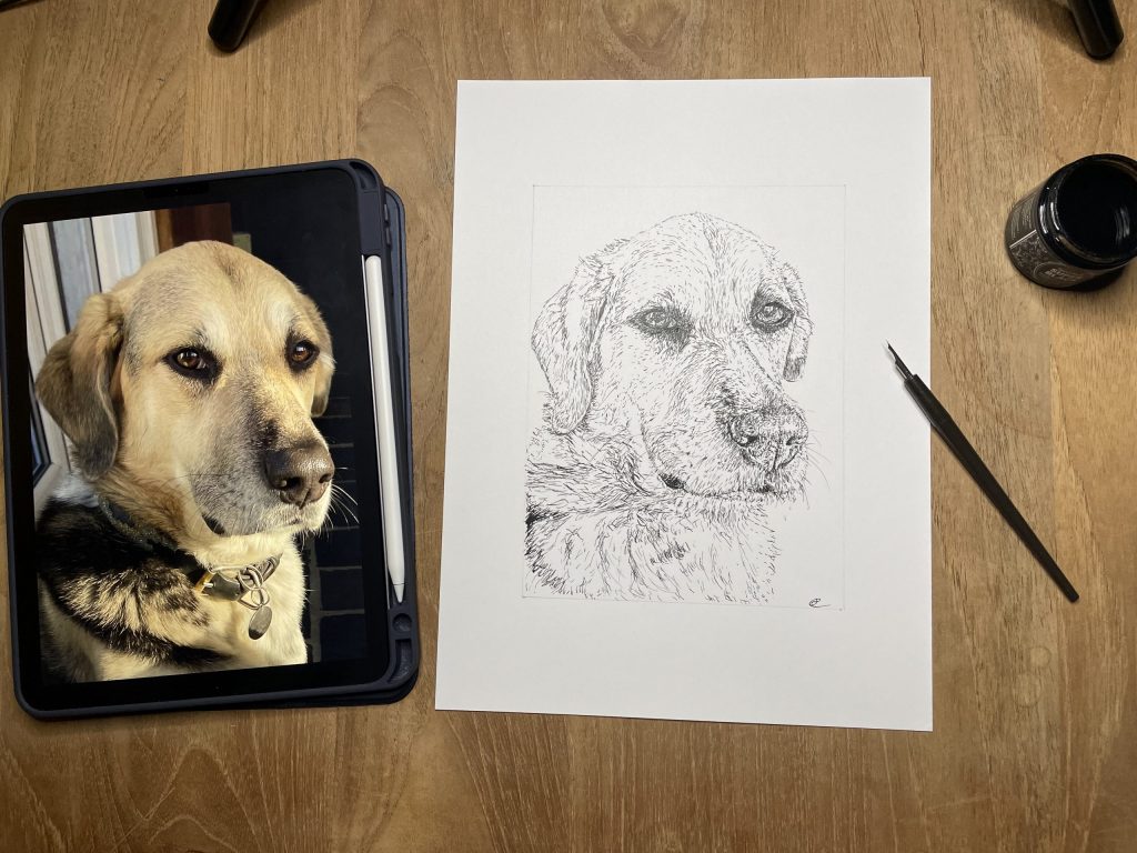 This is my favourite stage of the process, making marks to pring your pet to life. I use a dip pen and black indian ink for my drawings. I love the versatile nature of the dip pen nibs allowing the weight or thickness of a line to be dictated by pressure. It is the perfect tool for building up layers of texture and shading giving a real depth to my drawings.